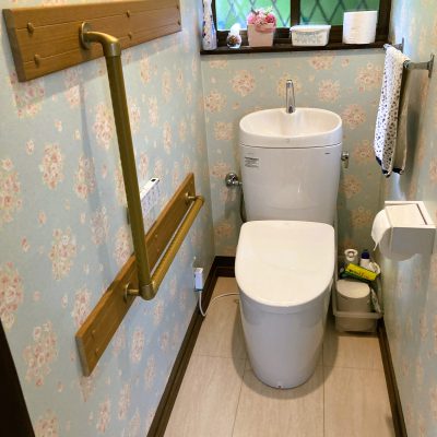 トイレ交換・床の張替・クロス貼替。トイレを安全に使用できるよう、手すり取付 Before After