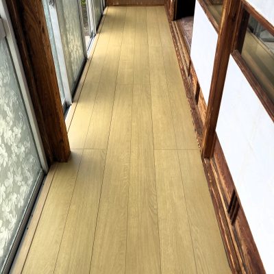 縁側の床。 劣化し汚れの落ちなくなったクッションフロアの上から、フローリングを重ね貼りしました。 B…